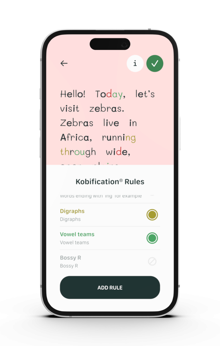 Kobification™ Rules highlights patterns like “sh,” “ea,” and more with colors — turning words into visual clues.