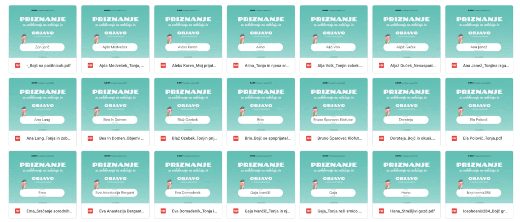 Diplomice prenesete iz povezave TUKAJ – učiteljice in starši boste morda lahko diplome natisnili, da bodo v trajen spomin. Vse zgodbe bomo v digitalno knjižnico dodajali postopoma do marca 2022. Takrat bo predvidoma izšla tudi knjiga.