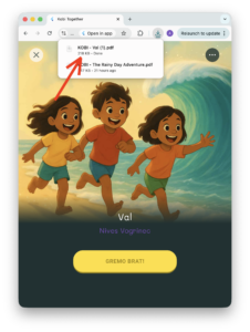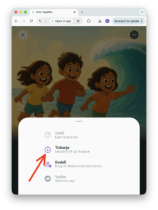 Ta funkcionalnost omogoča, da uporabnik besedila iz aplikacije KOBI natisne ali shrani v PDF datoteko. Na ta način lahko otrok bere tudi brez zaslona – v tiskani obliki, z vsemi prilagoditvami, ki jih pozna iz aplikacije (npr. barvne črke, razmiki, večja pisava). Funkcija omogoča enostaven prehod med digitalnim in fizičnim branjem.