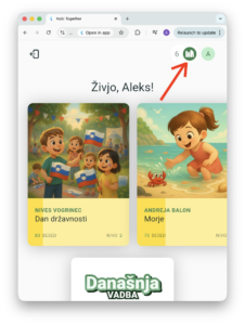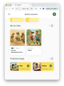 - Razdelek Trenutno berem prikazuje knjige, ki jih otrok bere ta trenutek.
