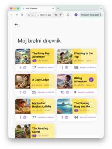 Moj napredek prikazuje čas branja, število prebranih besed in sej ter bralni dnevnik vseh prebranih knjig.
